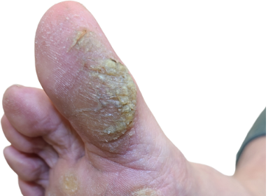 Corns and calluses are thickened, hardened layers of skin that develop on the feet, typically as a result of repeated friction or pressure. Corns present as smaller, localized hardened areas that can be painful when pressed, while calluses are larger and more diffused areas that are usually not painful.